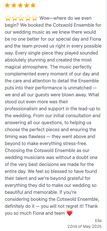 5-star ***** Cotswold Ensemble String Duo review on Encore: "Wow wow wow wow!!!!! 🤩🤩🤩 I honestly can’t share enough positivity with regards to this ensemble - I’d give them 10 stars if I could! We hired them for our wedding at Berkeley Castle last month and they were outstandingly talented, reliable, responsive, and so very flexible with us, and our song choices (some of which were quite unconventional). The only thing I regret is not being able to talk to them more on the big day / thank them more in-person, as I got swept up and being the bride. 😅 So Fiona and the team. Please accept my apologies, but thank you so, so very much! absolutely wonderful job and we will be recommending you to all our friends. 💕"