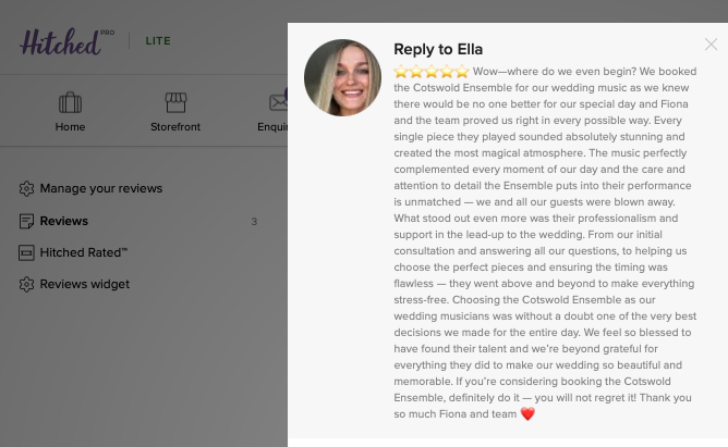 It was perfect and the music was just beautiful. So thank you for playing a big part of our day and making it so wonderful.(Cotswold Ensemble String Duo: J&J's wedding, The Swan at Bibury, Spring 2024)Fiona, Thank you so much for your efforts. It really was a great night for all.(Cotswold Ensemble Duo concert, Fiona & Jo at Sevenhampton church, Glocs, Winter 2023)Hi Fiona, Just wanted to say a massive thank you for you and the quartet on Saturday.You really added to our day and I am sorry I never got to say hello in person, your playing was beautiful. Thank you.(Cotswold Ensemble String Quartet: F&B's wedding, Blockley church, nr. Chipping Campden, Winter 2023)Dear Fiona, Wow, what can we say… thank you so much for making our ceremony extra special. ... It was truly magical!"(Cotswold Ensemble String Quartet: A&J's wedding, Dauntsey church, nr. Swindon, Autumn 2023)